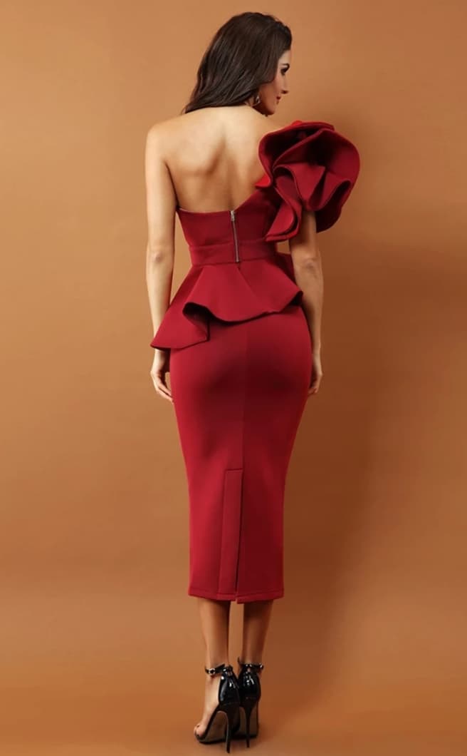 Robe rouge moulante , péplum mi long, bustier en forme de cœur , asymétrique, idal pour un cocktail ou soirée chic